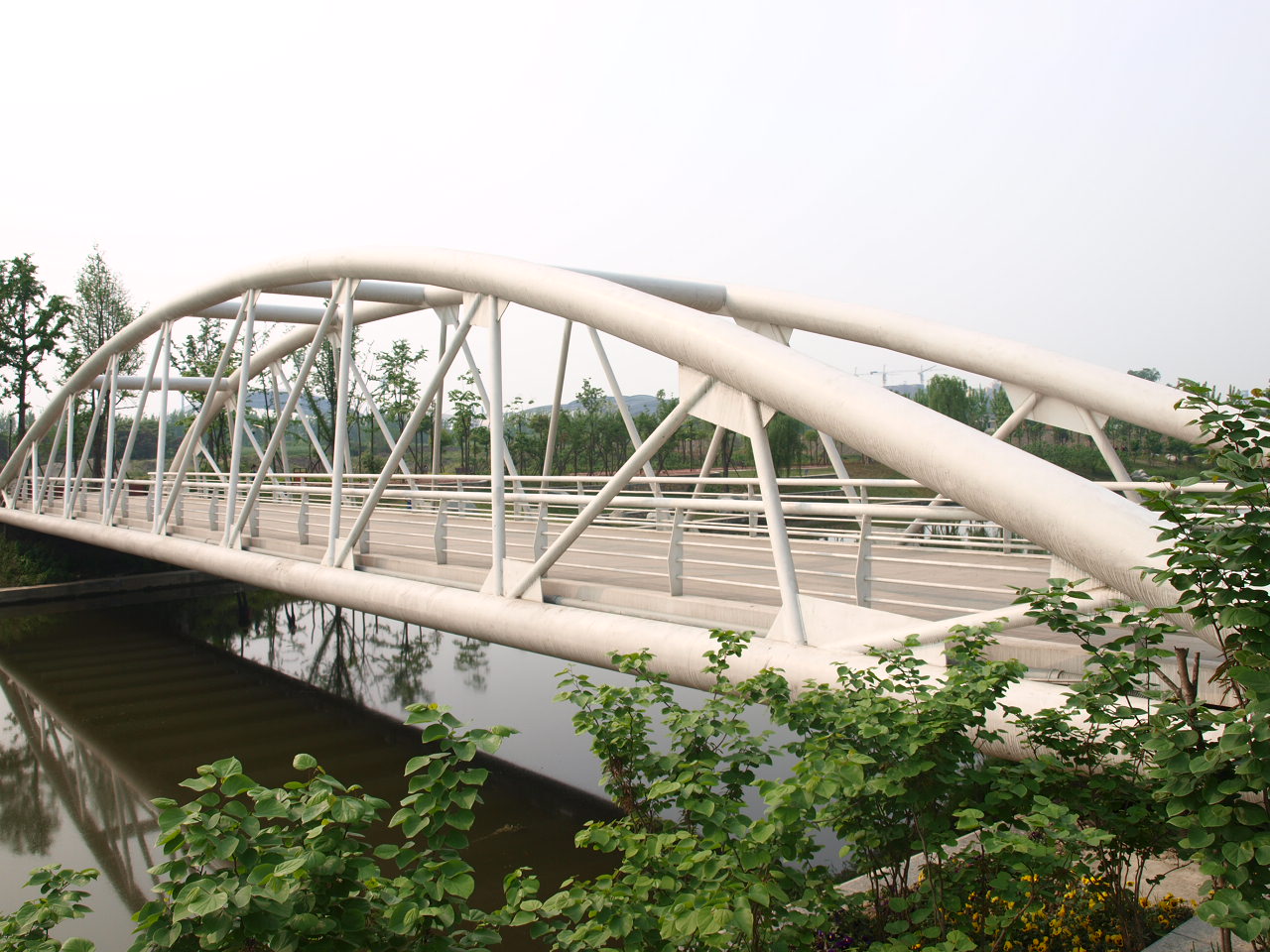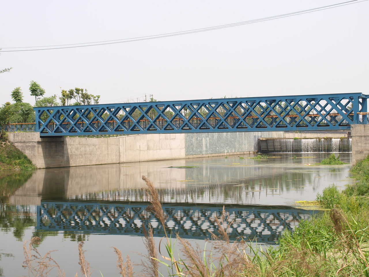 白河五座钢桥分别为:1号桥为单跨计算跨径47.96米的下承式拱桥,宽度6米,拱架最大吊装长度25.68米,吊装重41.0t,钢结构专业的工程量约为102.18吨。3号桥为箱梁桁架桥,跨度30米,宽度4.06米,钢结构专业的工程量约为67.49吨。4号桥为钢箱梁桥,跨度30米,宽度4.5米,钢结构专业的工程量约为89.77吨。5号桥为悬索桥(人行桥),跨度54米,宽度2.75米。6号桥为钢管桁架桥,跨度48米,宽度4.45米,拱架最大吊装长度27.7米,吊装重41.0t,钢结构专业的工程量约为87.96吨